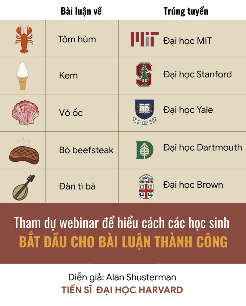 Thế nhưng, hãy nhìn kỹ điều này: cuộc đua về sự khác biệt, xét bản chất, vẫn là sự chạy theo một tiêu chuẩn nào đó. Định nghĩa về một bài luận tạo ra sự khác biệt cũng có cái “kiểu” của nó – chính là những tôm hùm, kem, vỏ ốc… mà bạn thấy trong bức ảnh phía trên. Người được tư vấn rồi sẽ có xu hướng nghĩ ra một vật thể nào đó khác làm ẩn dụ. Thậm chí, mình từng đọc một bài báo chia sẻ bí quyết viết luận ấn tượng cho một chương trình học bổng nổi tiếng của Mỹ, rằng nên bắt đầu bài luận bằng một đoạn hội thoại và kết bài bằng một hình ảnh.